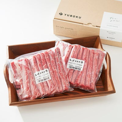 旨味の強いはなが牛のスライス2種類をセットにしました。ロース肉は脂の甘みがありつつ、様々な筋肉の複合的な味が感じられる万能の部位となっております。モモ肉はあっさりとしつつ舌の上に残る力強いお味が特徴となっています。