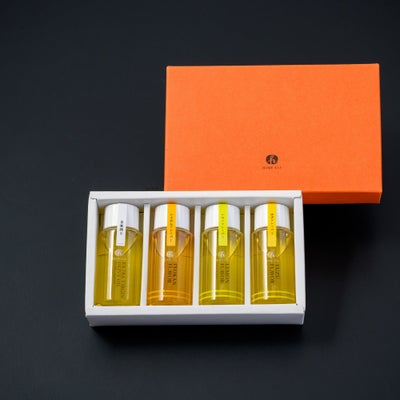 自家搾り(プレーン)エクストラバージンオリーブオイルと柑橘の香り高いフレーバーオリーブオイル(イヨカン・レモン・ユズ)のミニセット。