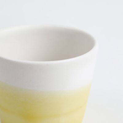 呉須の青、黄色の釉薬による清々しいラインは、 タイトルにもなっている着物の「帯」 を思わせます。 それぞれの色でマグカップと小カップを展開しています。