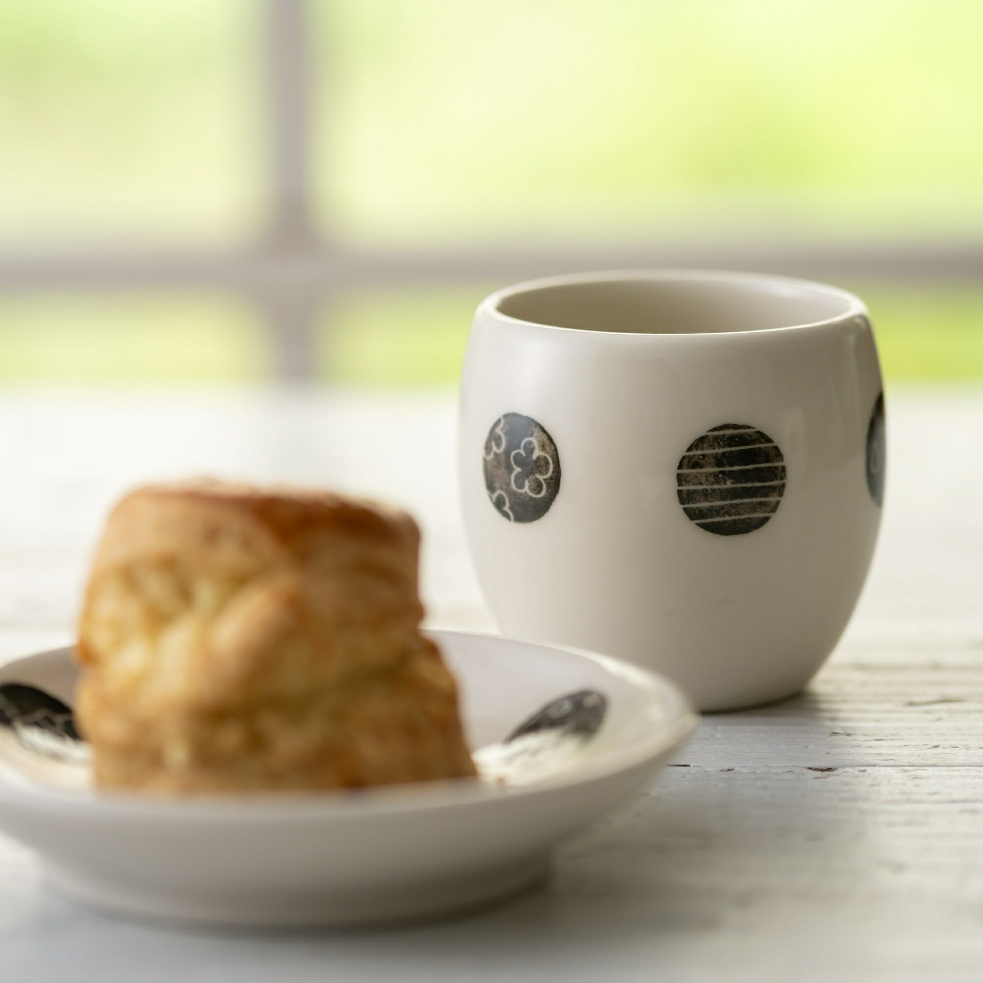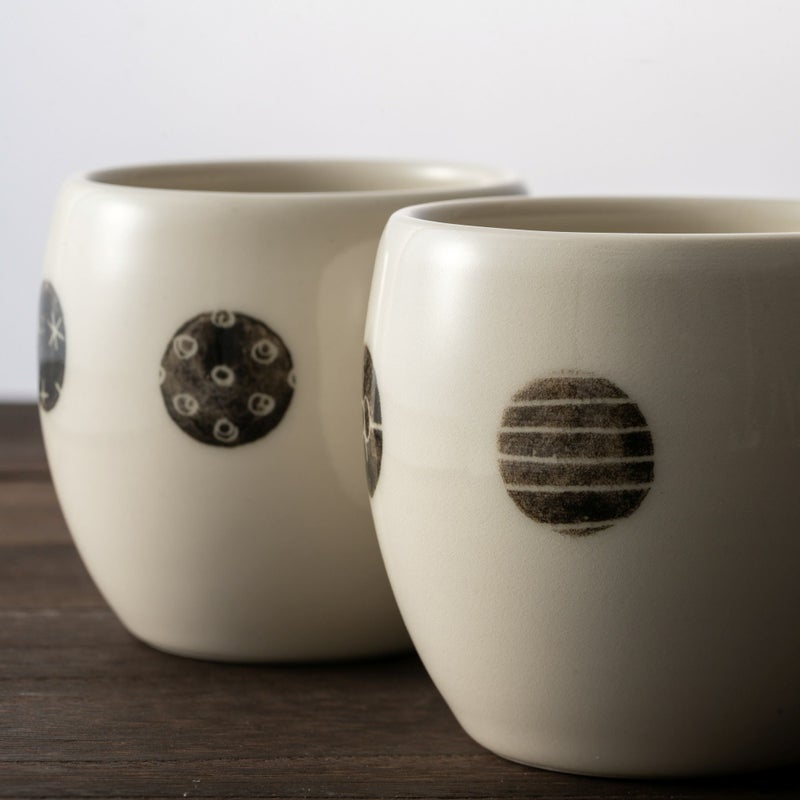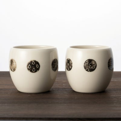 優しい色味の生地にドット柄の湯呑。