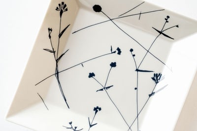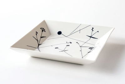 石本藤雄が道草の途中に見た草花の風景からインスピレーションを受けてデザインされた、プレート「MICHIKUSA」の角皿です。自然の中に自由に咲く、可憐な花々が描かれています。サイズは、20.5cm×20.5cmで、メインの料理にお使いいただけるサイズです。
