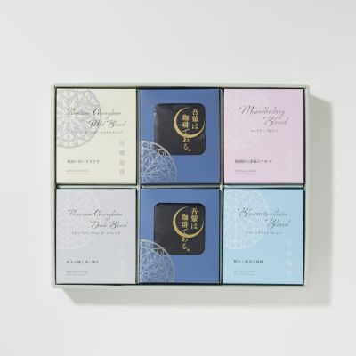 プレミアムチェリボンブレンドの「マイルド」と「ダーク」、人気の高い重厚感のある風味の「マンダリンブレンド」、バランスのとれた「ブルーマウンテンブレンド」、「吾輩は珈琲である」の厳選5種のドリップバッグセットです。