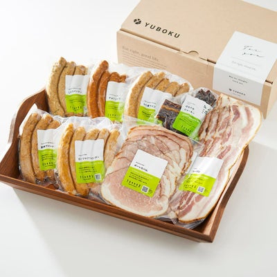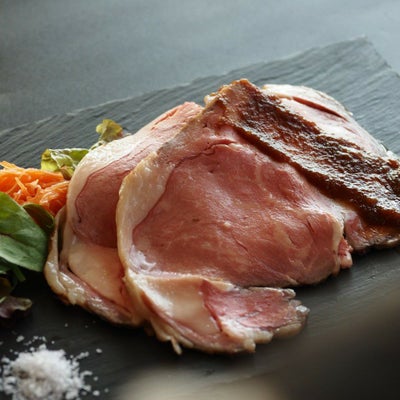 ベーコンは乾塩式で14日間以上熟成し旨味を引き出しスモークベーコンに。乾塩方式の塩漬け、乾燥熱のみで加熱を行うことによる余分な水分が抜けた”濃い”味わいが特徴です。