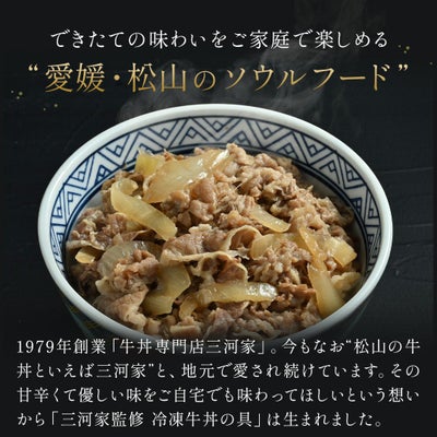 大手牛丼チェーン店が乱立する中、価格競争に負けず今もなお“松山の牛丼といえば三河家”と40年以上地元で愛され続けています。 創業以来、代々守り続けてきたこだわりの甘辛いタレは、地元醸造所から取り寄せた醤油と隠し味の味噌でじっくりと煮込み、とにかく松山の味にこだわっています。