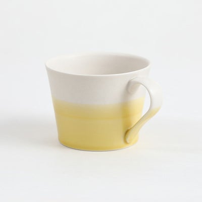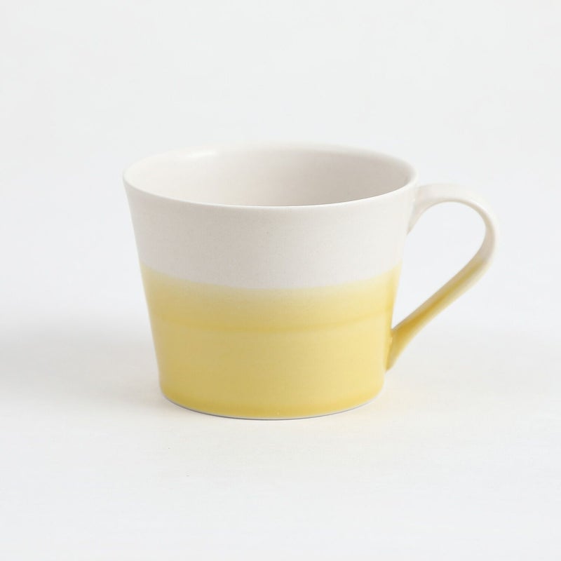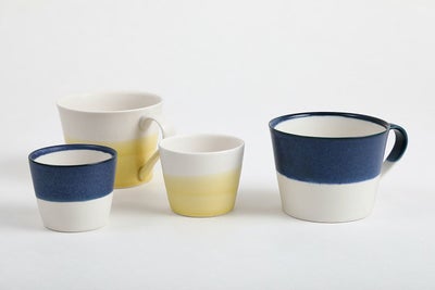呉須の青、黄色の釉薬による清々しいラインは、 タイトルにもなっている着物の「帯」 を思わせます。 それぞれの色でマグカップと小カップを展開しています。